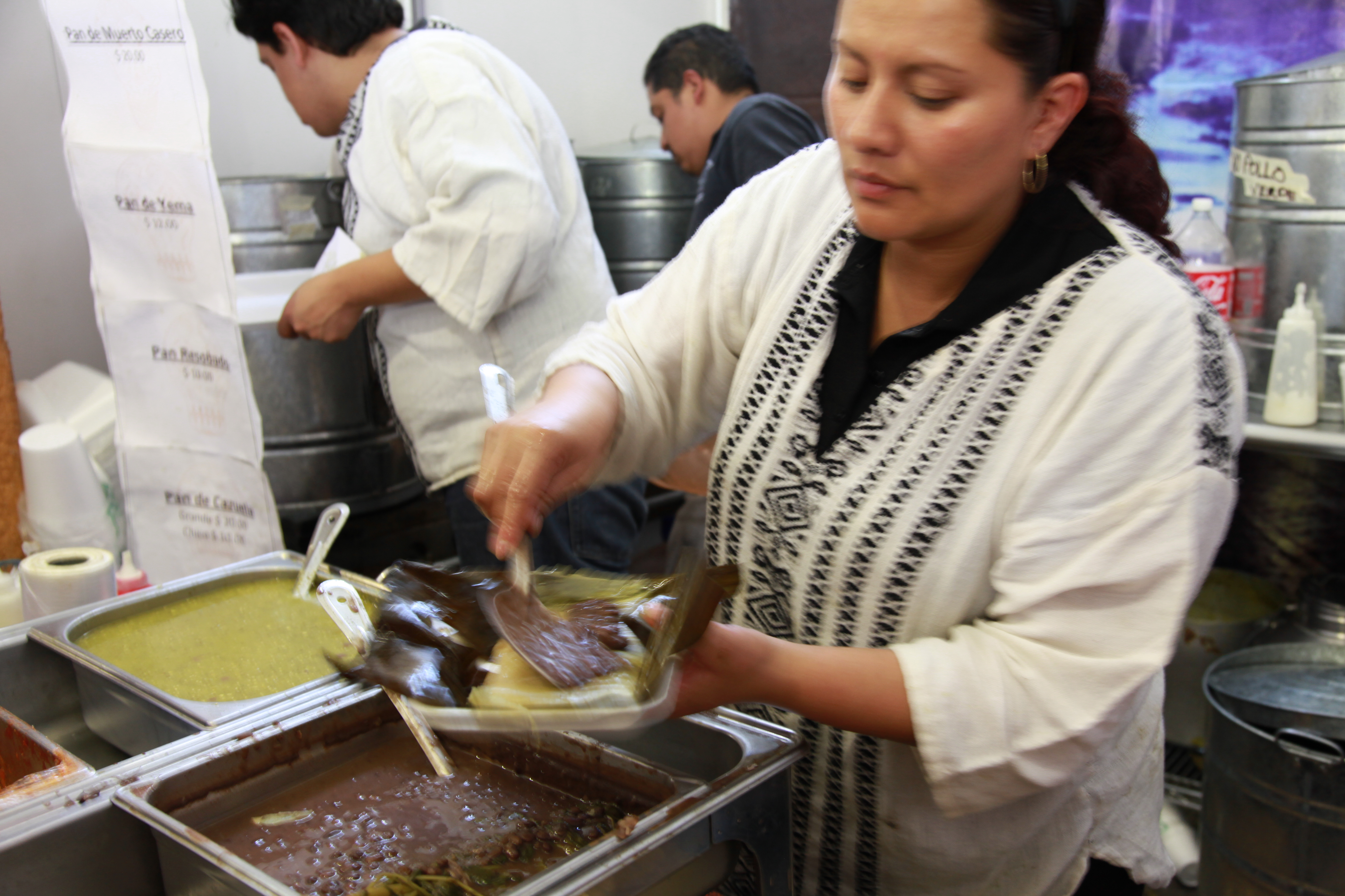 Después de darle la vuelta a la feria, cada una fue a su puesto favorito y compro una bebida y un pan de muerto diferente. El estomago nos dio para hacer dos paradas y esto fue lo que probamos: el chocolate con agua del puesto Yatzachil, el atole de cajeta del puesto Moctezuma, el chocolate con leche de la Cooperativa de Mujeres de Coyoacán, la semilla de vida en el puesto de Chiapas. Probamos el pan de queso de Zacatlán, que fue mi favorito, el relleno de frambuesa y avellana de Noisette, pan de muerto de amaranto y de la Cafetería Félix el atole de guayaba que estaba delicioso. Los precios son muy accesibles y los panes y demás estaban buenísimos. Después del coma diabético, decidimos matar la Feria con un pequeñísimo tamal de la Provincia Oaxaqueña cuyos rellenos iban desde mole, queso y rajas, verde, chocolate con queso, piña con queso y vegetarianos con una capa de frijoles, crema, salsa verde, roja y cebolla. El mejor tamal que he probado hasta hoy. Cada una se hecho el suyo y después de acabárnoslo no podíamos ni hablar. El tip para estas ferias es venir acompañados de amigos o familia, prohibido novios o novias porque estoy segura de que si hubiera ido el mío se hubiera espantado de todo lo que comí!